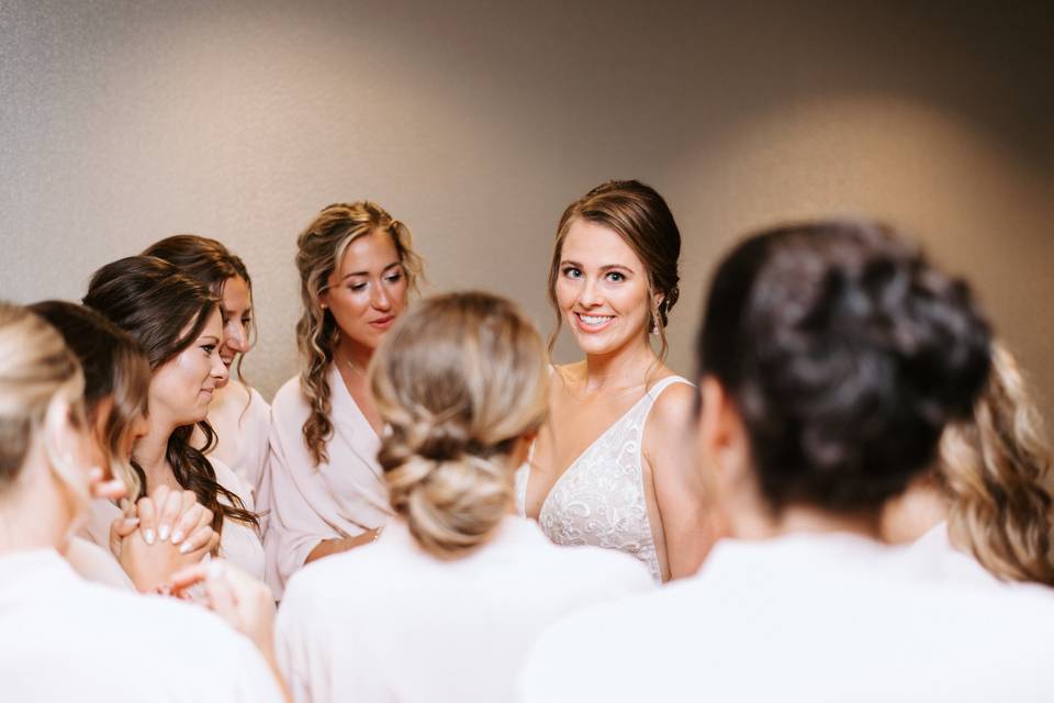 I worked with Carrie for hair (and bride’s makeup) and Tonya for makeup. Carrie and Tonya both showed up early (which is impressive with a 7 am start time), and we actually ran ahead of schedule! This Type A, highly anxious bride was SO HAPPY. Carrie and Tonya were both kind, professional, and so talented! Carrie did an especially wonderful job on updos and with my curly hair. Hair styles and makeup both lasted all day, which was amazing for a humid June day with outdoor photos prior to a 5 pm ceremony. Not a single woman had an eyelash come unglued or a bobby pin fall out. I felt like an absolute princess and was so happy to just relax and let Carrie and Tonya do their thing!