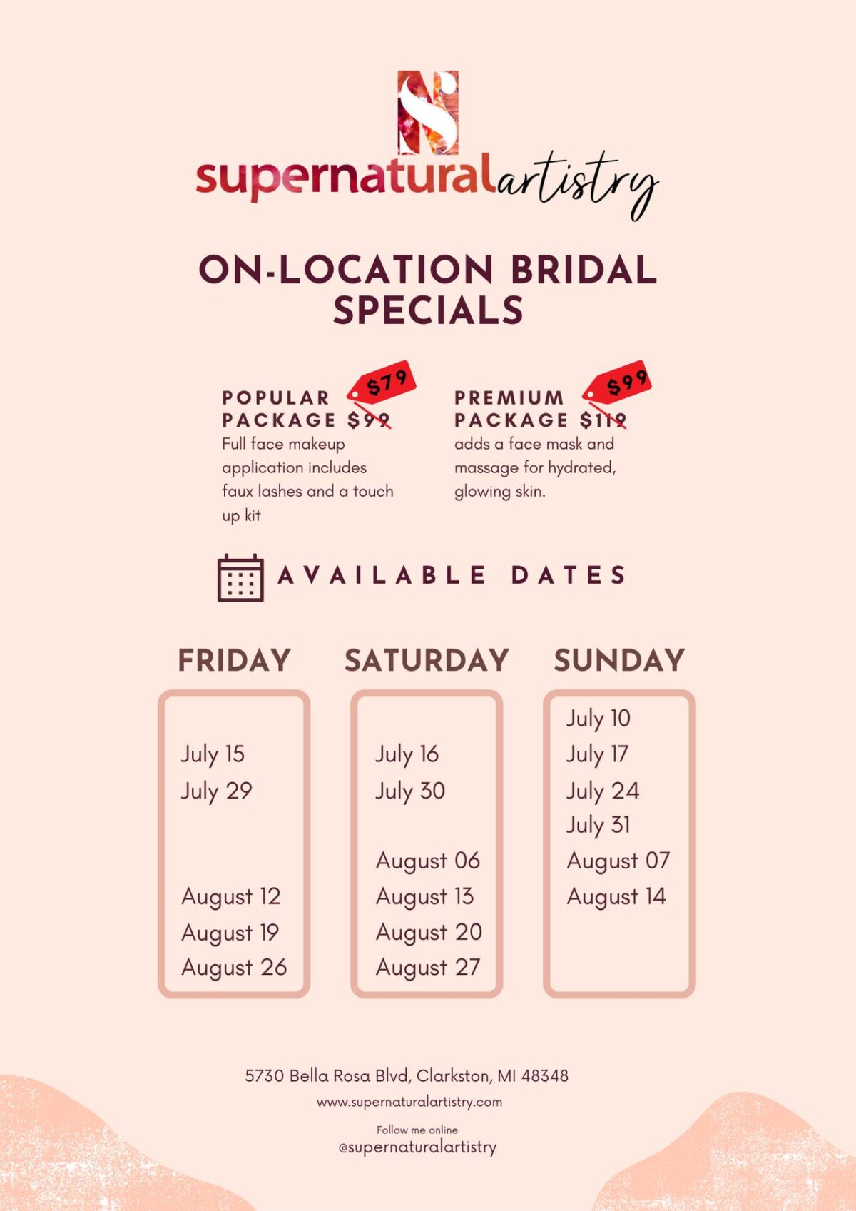 SuperNatural Artistry is a wedding styling service based in Clarkston, Michigan. Lead artist and founder Christine is a highly passionate and enthusiastic professional who loves working with clients on their special day. Having graduated from Multimedia Makeup Academy in 2018 with high honors, Christine is a proven and talented artist with a wealth of professional experience. She loves meeting new people, working with them to help their natural beauty shine bright for their big moment. Services Offered Christine understands that every client desires something different for their long-awaited occasion. With that in mind, she creates custom packages for each event, ensuring she can completely cater to your needs. As an on-site stylist, she can get you ready at your venue, saving you precious time on your special day.